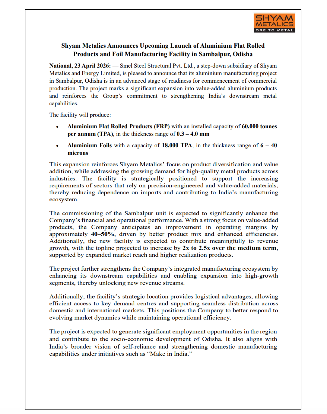 Shyam Metalics & Energy Ltd. has announced the upcoming launch of an aluminium flat rolled products and foil manufacturing facility in Sambalpur, Odisha, marking a strategic expansion into value-added aluminium products.