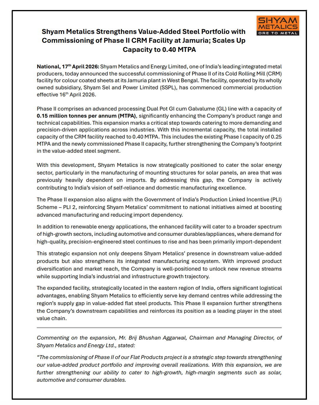 Shyam Metalics announced the successful commissioning of Phase II of its Cold Rolling Mill (CRM) facility at Jamuria, West Bengal. The facility has already commenced commercial production from April 16, 2026.