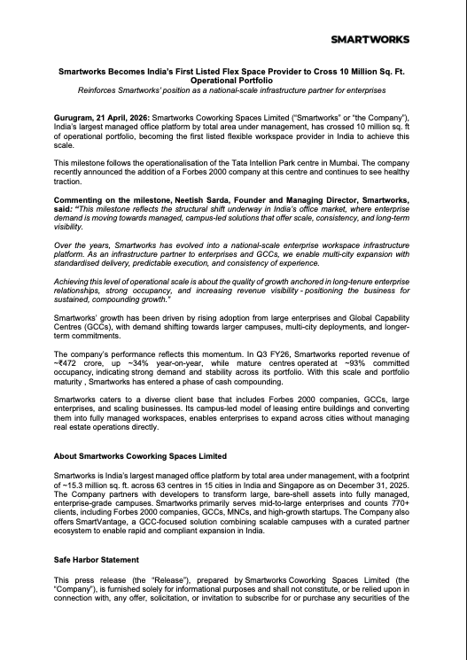 Smartworks announced it has crossed 10 million sq. ft. of operational portfolio, becoming India’s first listed flex space provider to achieve this scale, supported by recent portfolio additions and enterprise demand momentum.