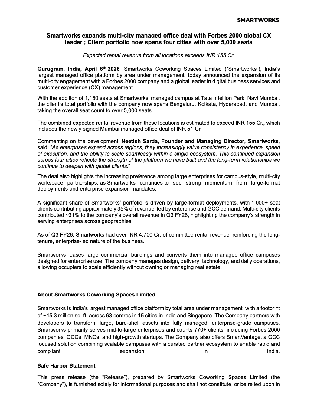 Smartworks Coworking Spaces Limited announced the expansion of its engagement with a Forbes 2000 global CX leader, extending its presence across multiple cities.