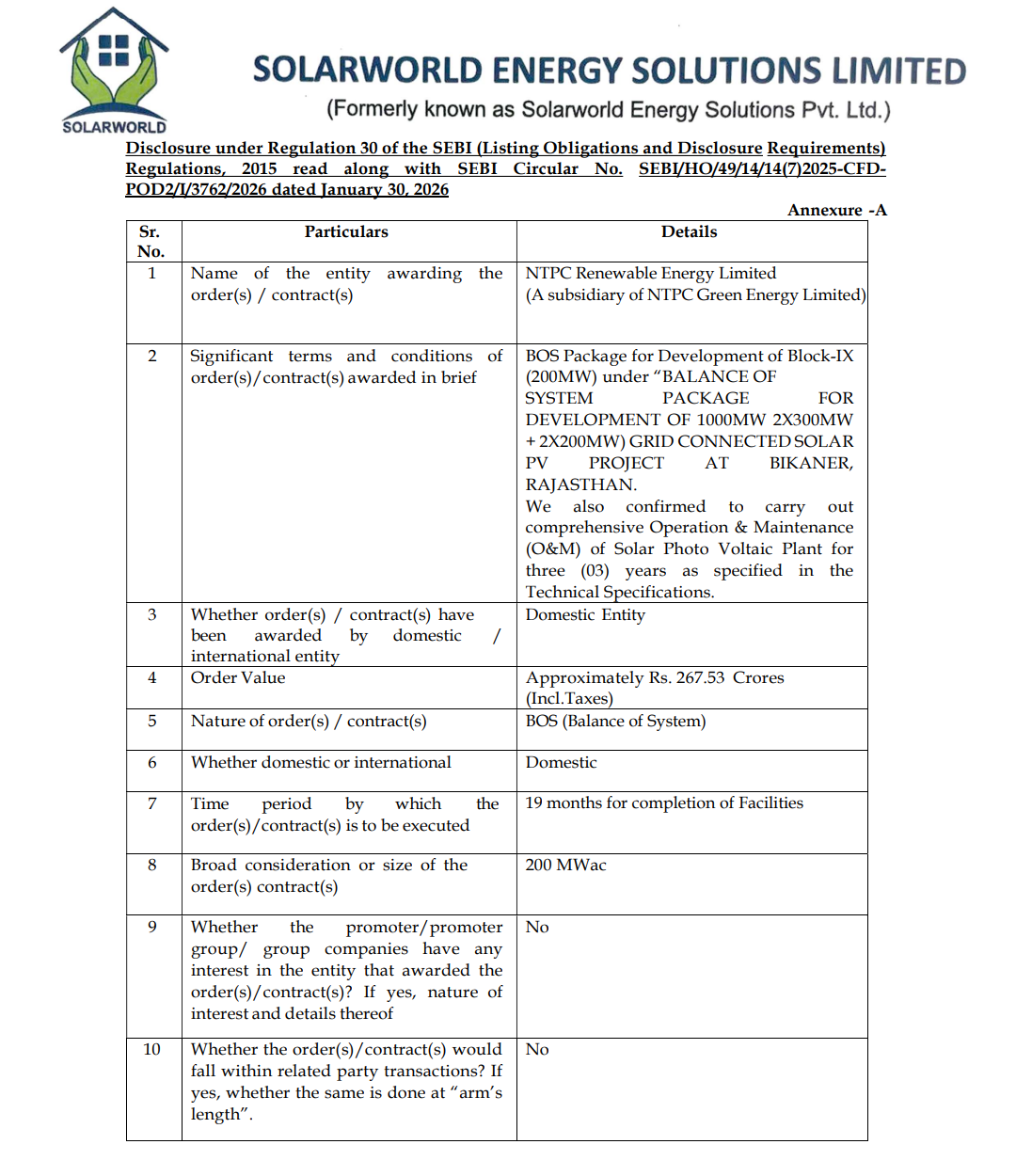 Solarworld Energy Solutions Limited has secured a ₹267.53 crore order from NTPC Renewable Energy Ltd for a 200 MW solar BOS (Balance of System) package, strengthening its position in India’s renewable EPC space.