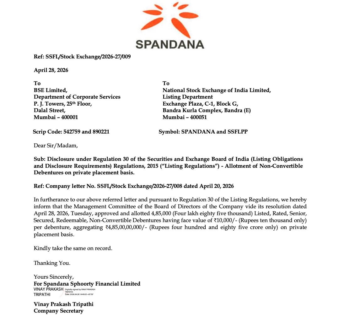 Spandana Sphoorty Financial Limited has allotted ₹485 crore worth of secured, rated Non-Convertible Debentures (NCDs) via private placement, strengthening its funding base for lending operations