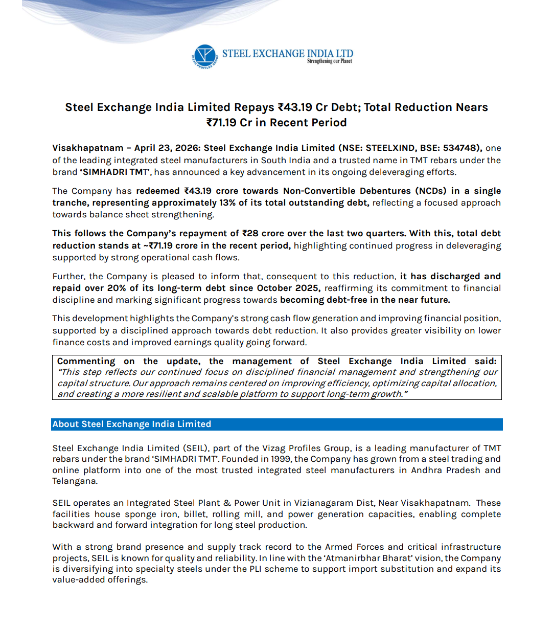 Steel Exchange India Limited has repaid ₹43.19 crore of debt in a single tranche, taking total debt reduction to ~₹71.19 crore in recent periods, reflecting strong deleveraging and improving financial health.