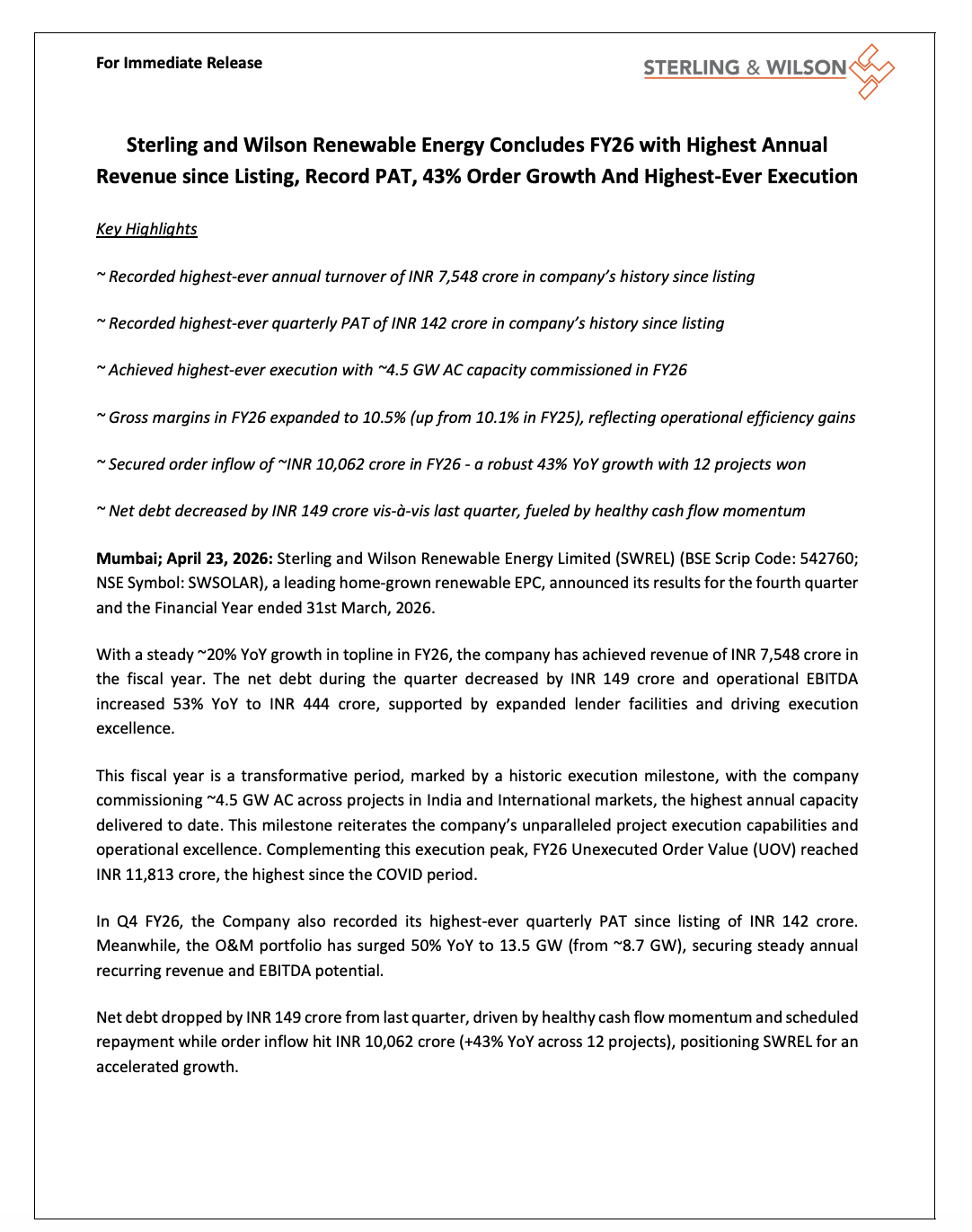 Sterling & Wilson Renewable Energy announced its audited FY26 and Q4 results, reporting record revenues, improved profitability, and strong execution performance, supported by robust order inflows and expanding global footprint.