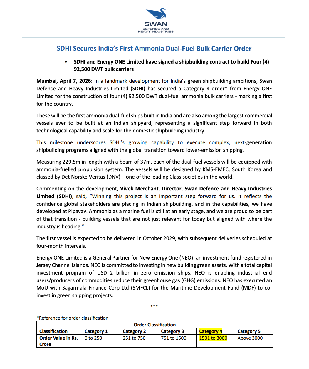 Swan Defence and Heavy Industries Limited (SDHI) has secured a landmark shipbuilding order from Energy ONE Limited for four ammonia dual-fuel bulk carriers, marking India’s first such project with an estimated order value in the ₹1500–3000 crore range.