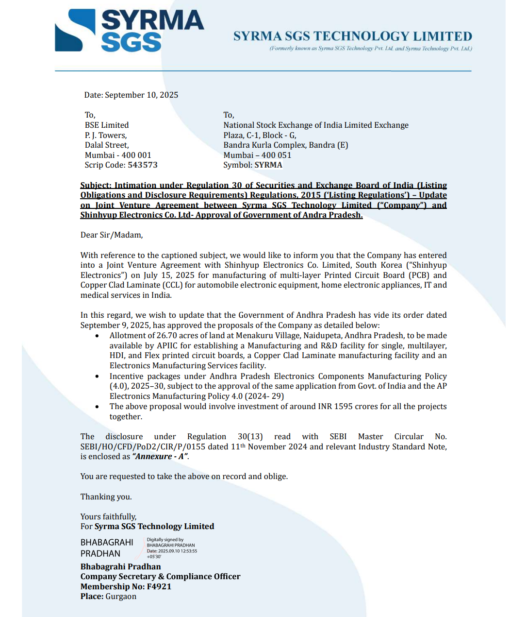 Official Exchange Filing: Syrma SGS Technology Limited
