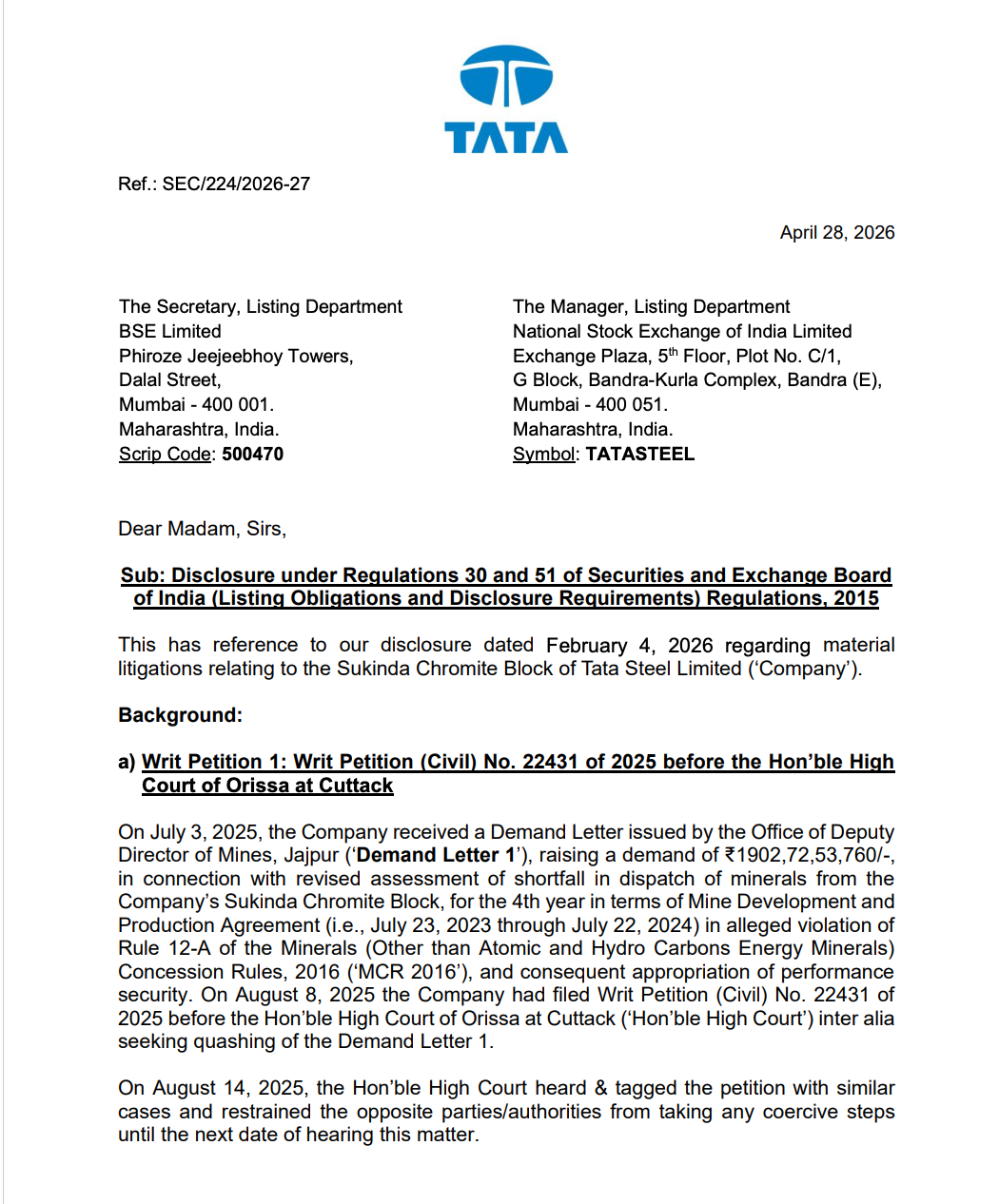 Tata Steel received the final judgment dated April 20, 2026 from the Orissa High Court in relation to two writ petitions challenging demand notices issued by mining authorities.