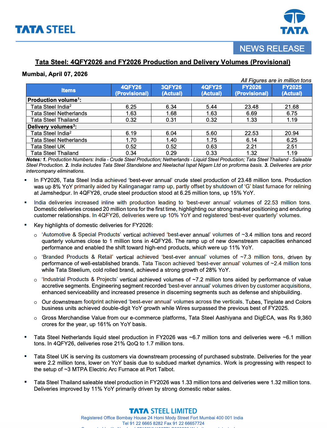 Tata Steel released its provisional production and delivery volumes for Q4FY26 and FY2026, highlighting strong operational performance across geographies.