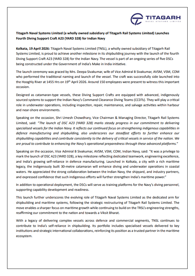 Titagarh Naval Systems Limited (TNSL), a wholly owned subsidiary of Titagarh Rail Systems, has launched the fourth Diving Support Craft (DSC A23 / YARD 328) for the Indian Navy, marking progress in execution of an ongoing five-vessel series.