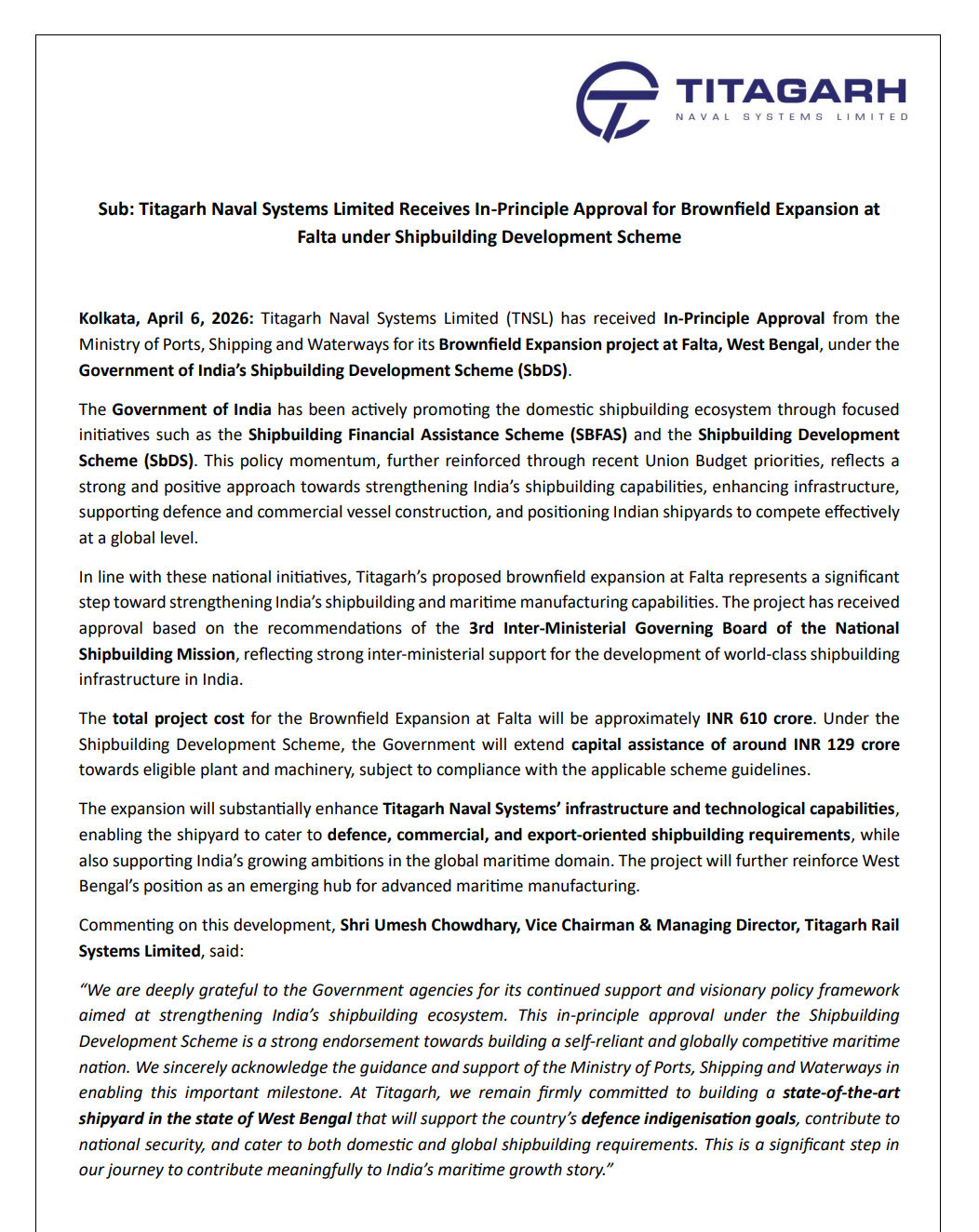 Titagarh Naval Systems Limited (TNSL), a wholly owned subsidiary of Titagarh Rail Systems Limited, has received in-principle approval from the Ministry of Ports, Shipping and Waterways for its brownfield expansion project at Falta, West Bengal.