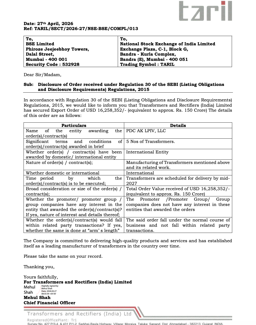 Official Exchange Filing: Transformers and Rectifiers (India) Ltd
