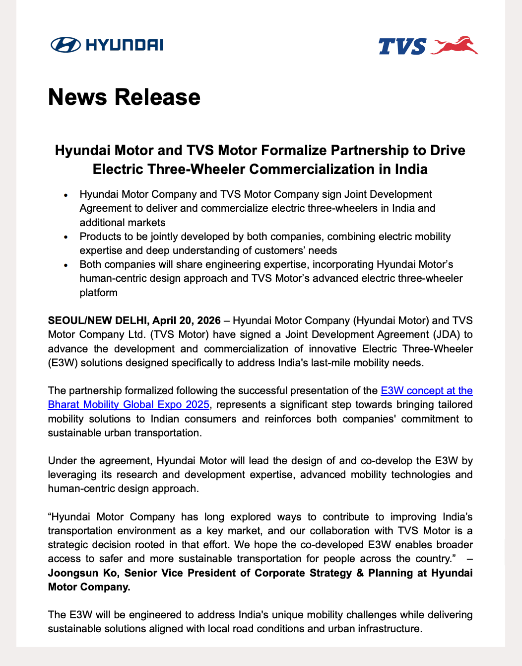 TVS Motor announced signing of a Joint Development Agreement with Hyundai Motor Company for electric three-wheelers.