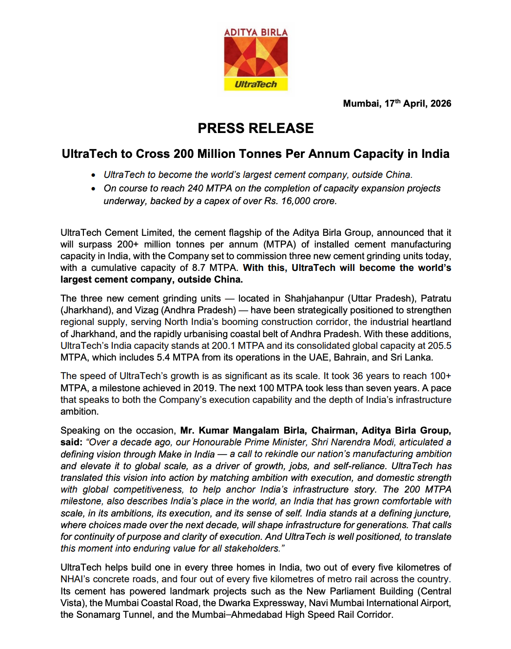 These additions increased the company’s India capacity to 200.1 MTPA and consolidated global capacity to 205.5 MTPA.