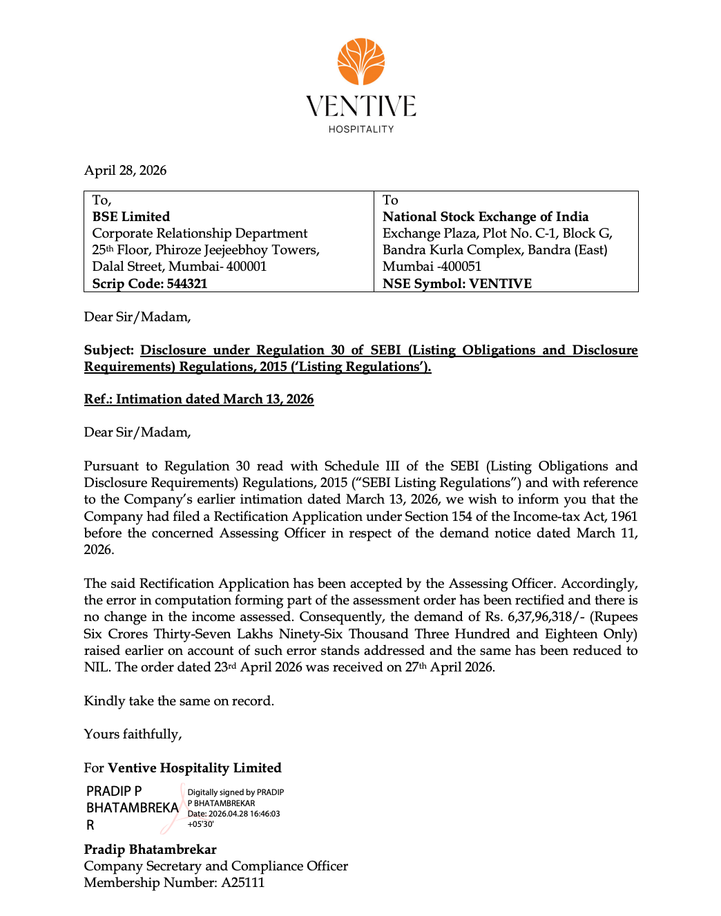 Ventive Hospitality Limited has received relief after the tax authority accepted its rectification application, resulting in the entire tax demand of ₹6.38 crore being reduced to NIL