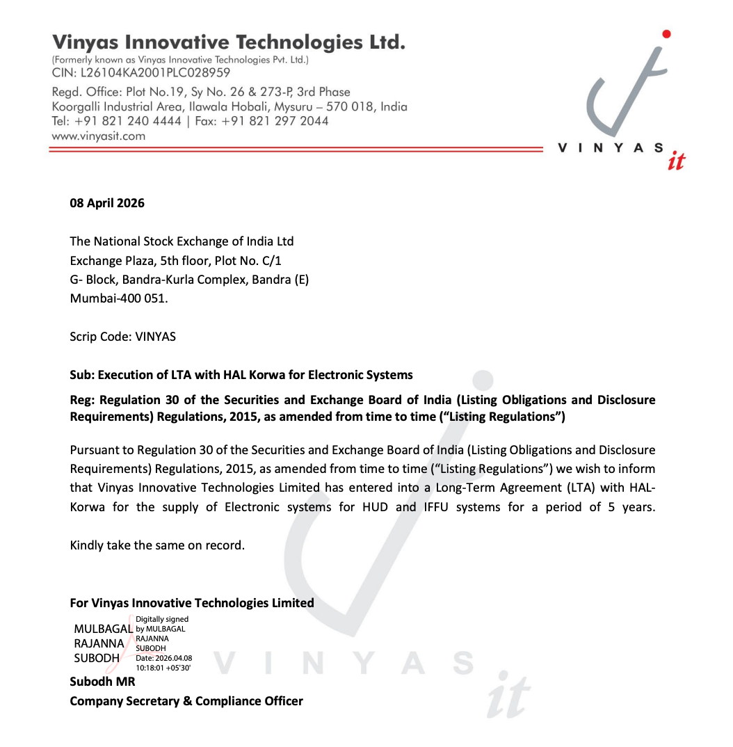 Vinyas Innovative Technologies Limited has entered into a Long-Term Agreement (LTA) with HAL Korwa for the supply of electronic systems for HUD and IFFU systems.