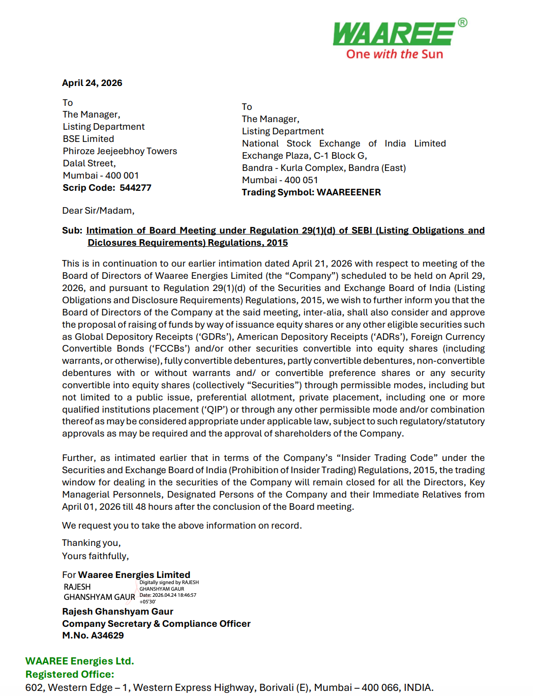 Waaree Energies Limited has notified the exchanges that its Board of Directors, in the meeting scheduled on April 29, 2026, will consider and approve a proposal for raising funds through various instruments and permissible modes.