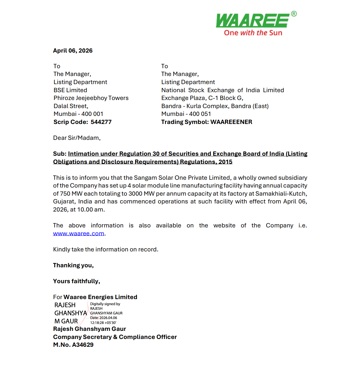 Official Exchange Filing: Waaree Energies Limited