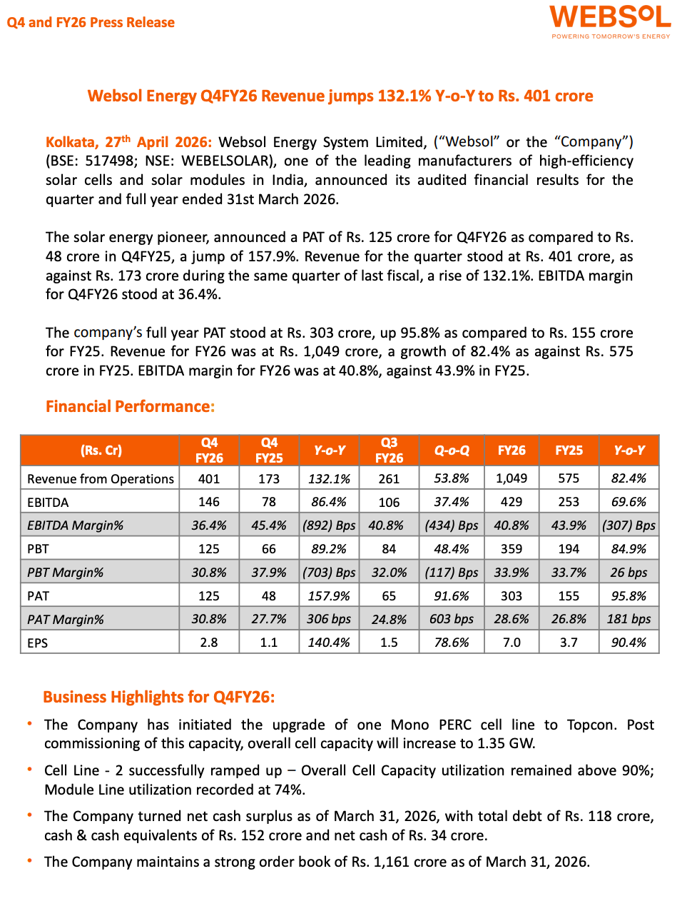 Websol Energy System Ltd reported a strong Q4FY26 performance with 132% YoY revenue growth and 158% YoY PAT growth, driven by capacity expansion, improved utilization, and operating efficiency