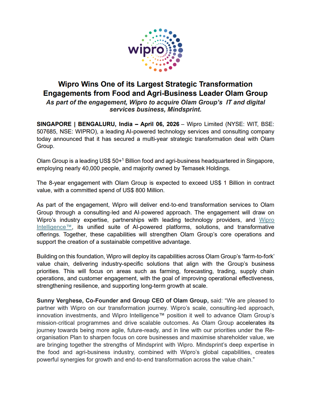 Wipro Secures $1 Billion Strategic Deal with Olam Group; To Acquire Mindsprint