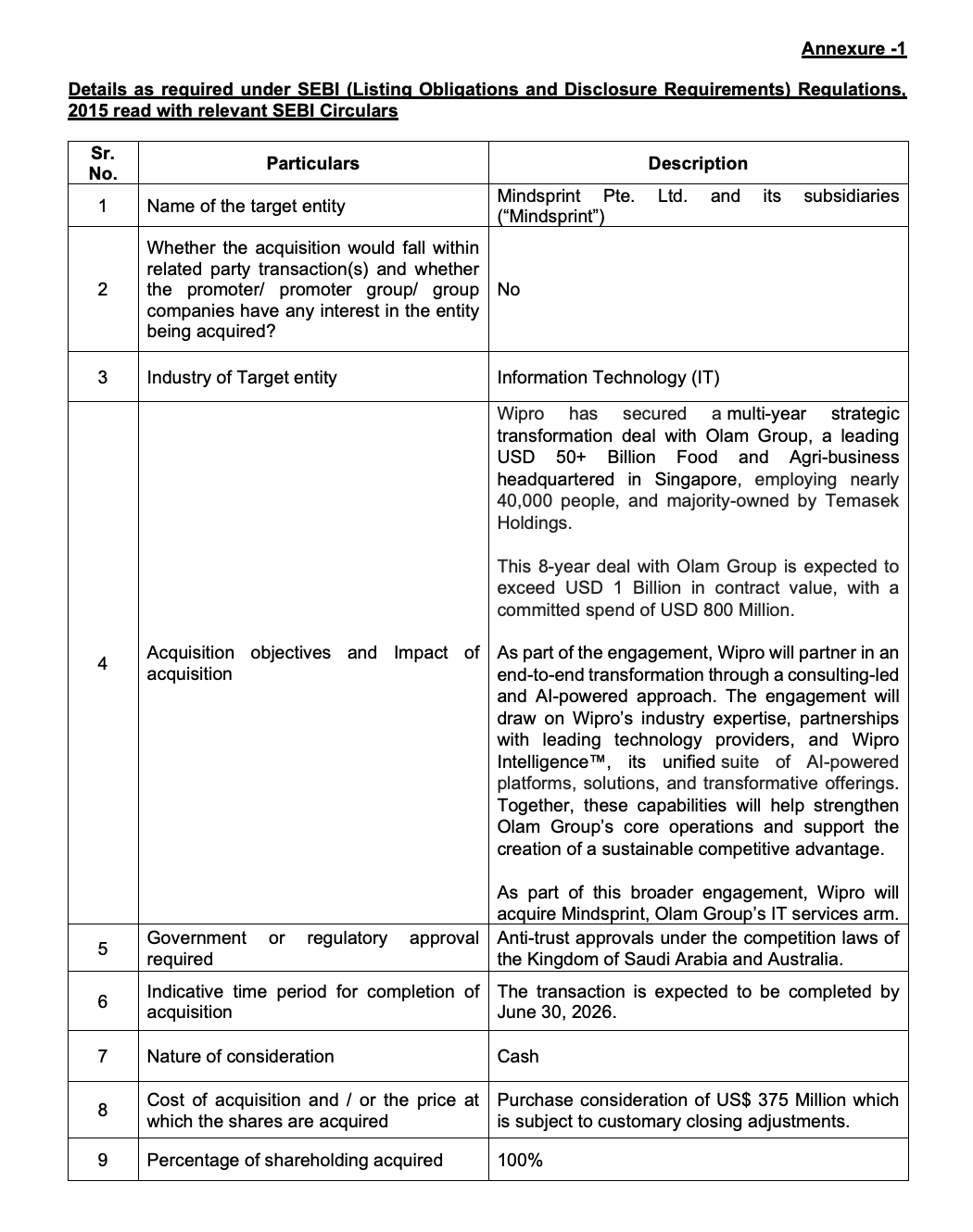 Mindsprint is the IT services arm of Olam Group and will become a wholly owned subsidiary of Wipro after completion.