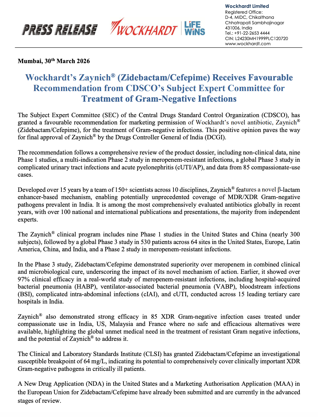 Immediate Effect: Clears path for final approval by DCGI, Strengthens Wockhardt’s pharma pipeline.