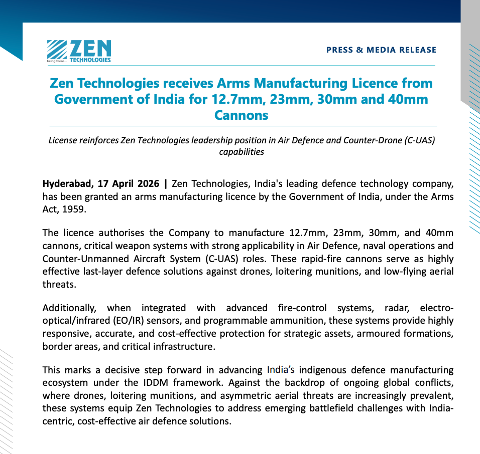 Zen Technologies has received an arms manufacturing licence from the Government of India to produce 12.7mm, 23mm, 30mm, and 40mm cannons, strengthening its position in air defence and counter-drone systems