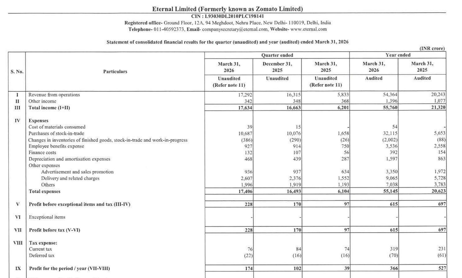 Official Exchange Filing: Zomato (Eternal) Ltd