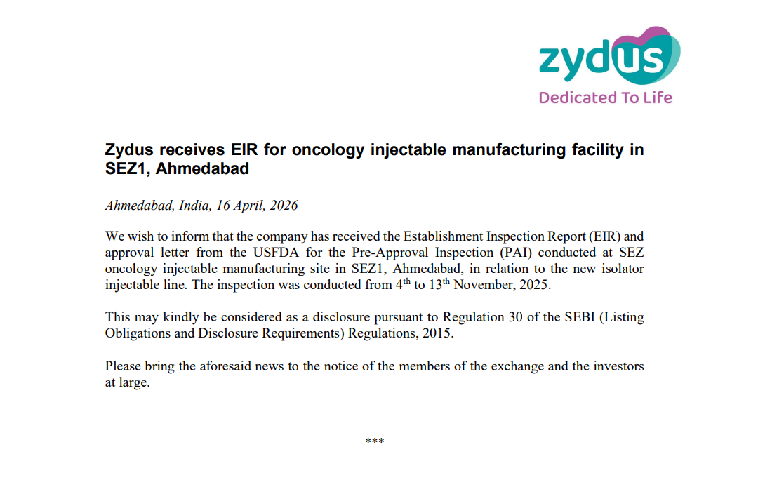Zydus Lifesciences has received the Establishment Inspection Report (EIR) from the USFDA for its oncology injectable manufacturing facility in SEZ-1, Ahmedabad, marking a key regulatory milestone for its injectable portfolio expansion.